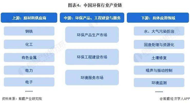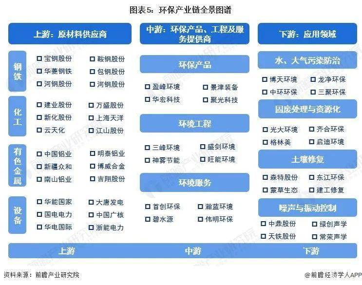 从环保产业链的参与企业上看,上游参与企业主要有宝钢股份 、建业股份 、中国铝业 和华能国际 等;中游环保设备、工程及服务提供商主要包括盈峰环境、三峰环境 和首创环保等;下游应用领域企业主要包括龙净环保 、光大环境、森特股份 和中鼎股份 等。