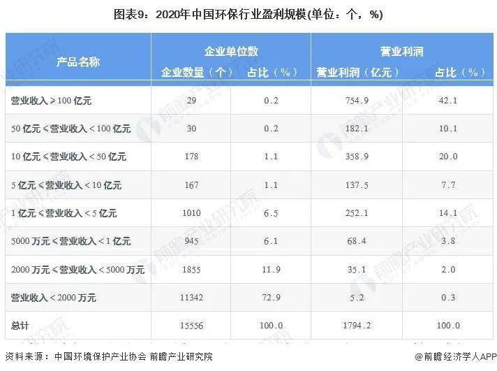 ——中国环保行业盈利规模分析:93.9%的营业利润集中在年营业收入1亿元以上的1414家企业