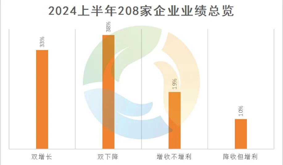 这个上半年,环保行业没有出现“忽如一夜春风来,千树万树梨花开”的奇迹,但对比前几年接连下滑的惨淡业绩,也还算是平稳渡过,同时也不乏环保企业定准方向,通过向内调整以及向外寻找增量空间,而获得不错的业绩表现。盘点一下2024年208家上市环保企业半年报情况。(完整表格见文末)先来看看整体的数据表现。208家上市环保企业中,有108家实现了营业总收入同比增长,占比51.92%;89家实现净利润同比增长,占比也达到42.79%。