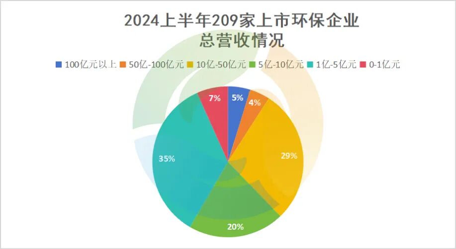 总营收方面,处于1-5亿元区间的企业数量最多,共有72家,占比达35%;其次是10-50亿元区间共有60家企业、占比达29%,5-10亿元区间共有43家、占比达20%。此外,14家企业总营收获得1亿元以下的总营收业绩,占比达7%。10家环保企业进入总营收“百亿俱乐部”,占比达5%;此外还有9家环保企业总营收处于50-100亿元,占比达4%。也就是说,在2024上半年的210家上市环保企业中,9%的环保企业总营收超过50亿元。