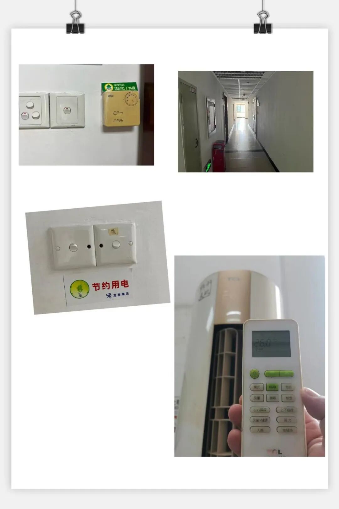 节约用电,午休、下班随手关闭计算机、打印机等设备,空调不低于26℃。节约用水,用水完毕及时关闭用水器具,发现跑冒滴漏及时报修。节省耗材,推行无纸化办公,纸张重复利用,尽量不使用纸杯等易耗品。