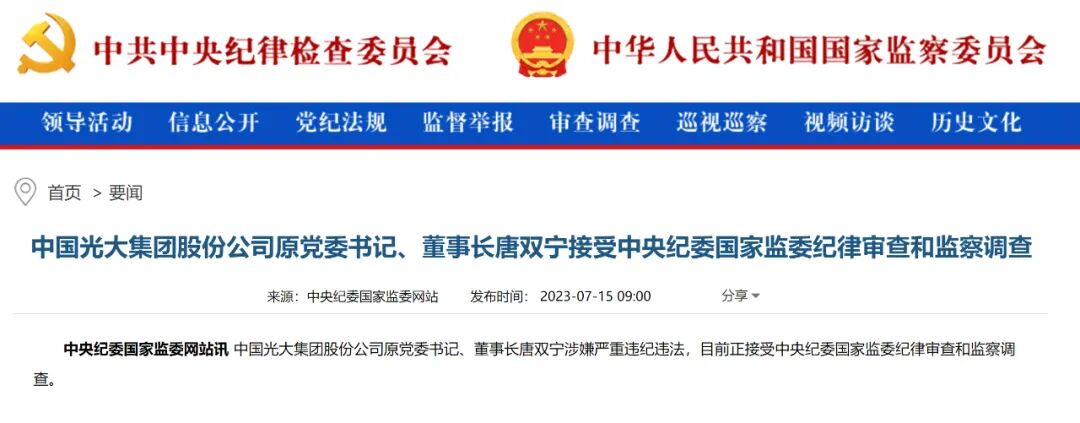 7月13日,唐双宁被带走调查的消息就开始在网上流传,7月15日靴子落地。据中央纪委国家监委消息,中国光大集团股份公司原党委书记、董事长唐双宁涉嫌严重违纪违法,目前正接受中央纪委国家监委纪律审查和监察调查。
