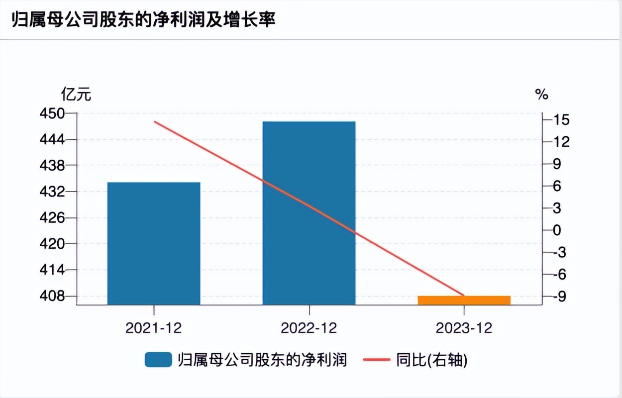 从归母净利润来看,2023年,光大银行实现归母净利润407.92亿元,同比下滑8.96%。值得一提的是,这也是光大银行近十年来,归母净利润首次下滑。