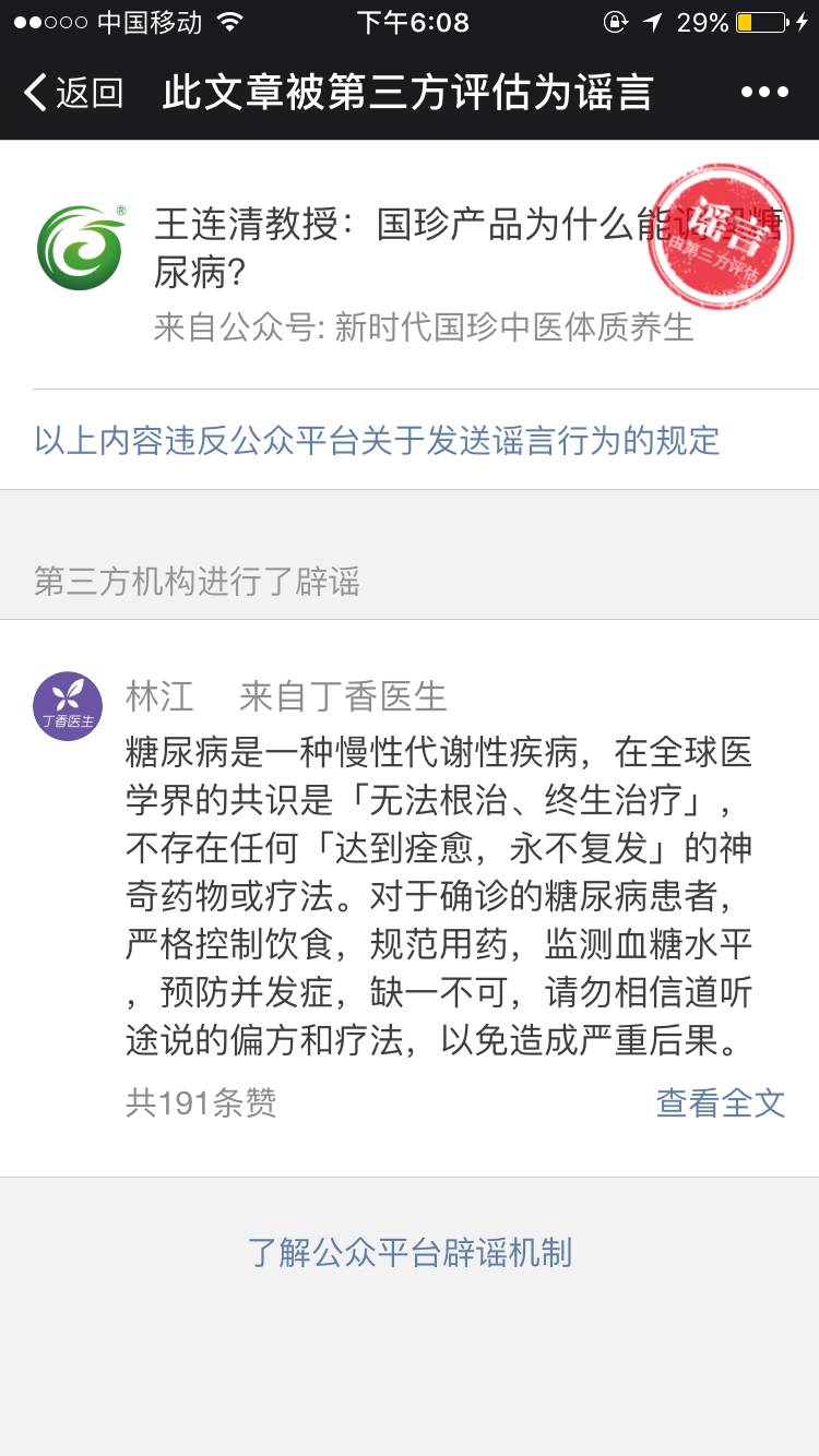 ▲新时代发送的这篇文章,被我成功举报,权威医疗机构判定为谣言!