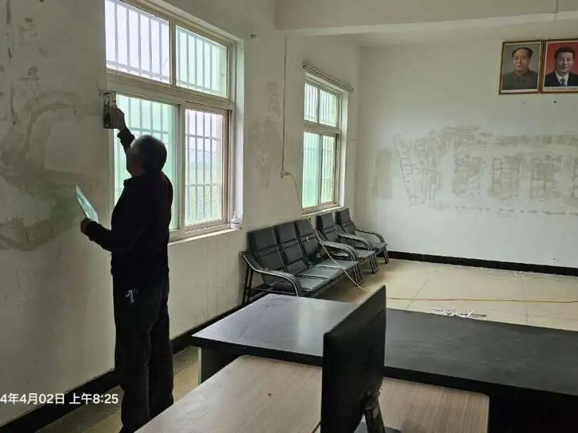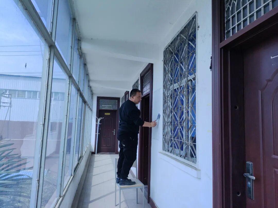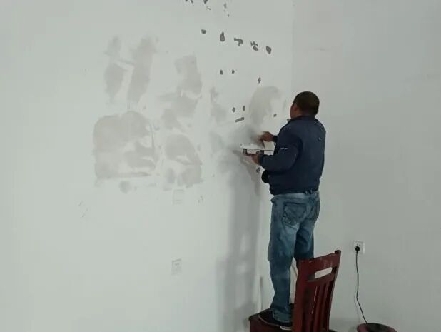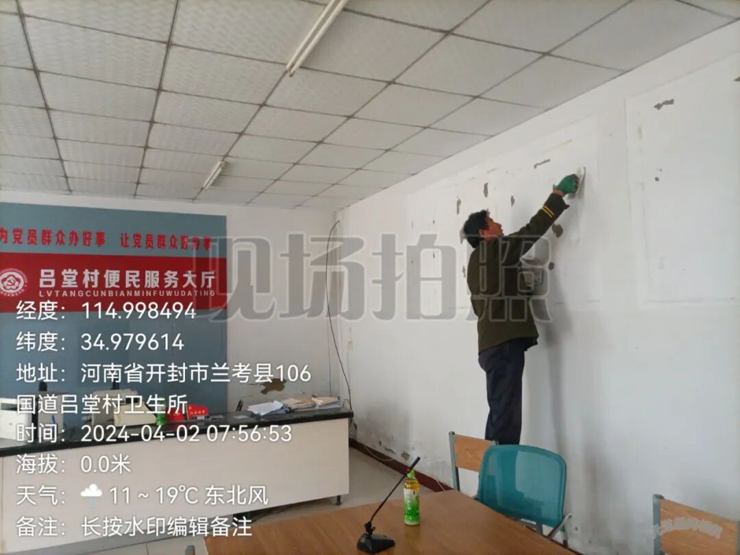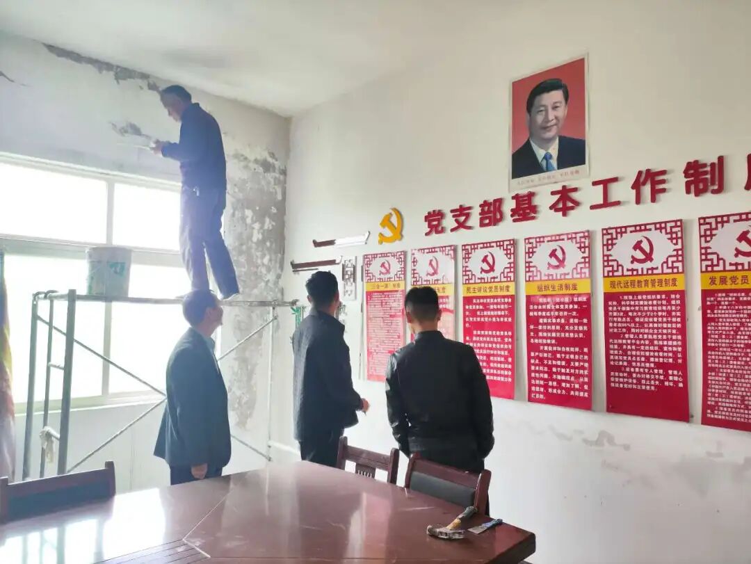 堌阳镇各村组织人员对破旧版面拆除后的墙面进行粉刷。