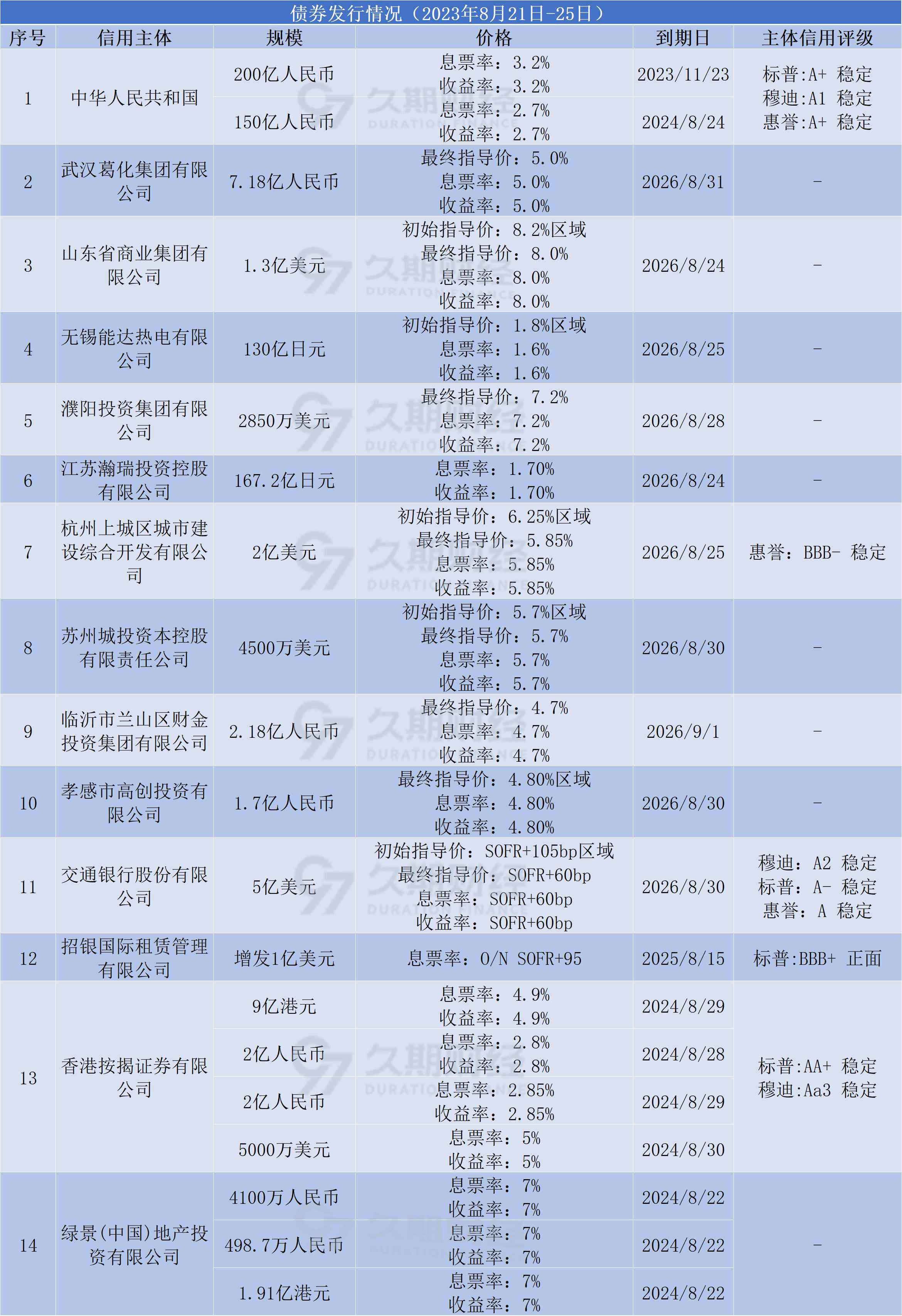 公司公告及新闻方面,碧桂园(02007.HK)的部分境内债持有人要求该开发商全额偿付将于下个月初到期的“16碧园05”,该只债券已于近期公布展期方案;远洋集团(03377.HK)发布公告,拟将“18远洋01”展期1年分期兑付;旭辉集团提请将“21旭辉03”兑付日调整为2026年9月14日;中国人寿表示高度关注远洋集团(03377.HK)的经营情况,公司持有远洋集团的股份属于财务性投资;方圆地产未能支付GZFYRE 13.6 07/27/23本息;金辉控股(09993.HK)完成发行8亿元中期票据;金科股份(000656.SZ)“20金科地产MTN002”未能按期足额偿付本息;碧桂园(02007.HK)拟12.915亿元出售联营公司广州利合房地产26.67%股权;融创中国(01918.HK)拟于9月18日召开公司计划债权人会议;中国恒大(03333.HK)公布中期业绩和境外债重组协议安排详情及进展;重庆龙湖企业称,公司股东市场化购买不超过5亿元人民币公司债券。