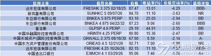 此外,上周13家公司共发行18只离岸债,一级发行数量明显回升,总规模折合逾16亿美元(前一周约为10亿美元),同比增加60%,包括日元和港元债券各2只、美元债和离岸人民币计价债券各7只。城投板块发行热络,9家公司共发行9只境外债,规模达7.6亿美元,较前一周(0.9亿美元)大幅增加近6.7亿美元;金融板块发行规模与前一周持平,约为8.2亿美元;地产板块,绿景中国地产发行3只债券,分别以离岸人民币和港元计价,息票率均为7%,总规模折合仅为约3000万美元,上述债券均没有在交易所挂牌。