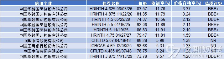 中资离岸债方面,一级市场发行规模回升,发行人以城投为主。二级市场方面,地产板块在政策利好的加持下逐渐企稳,投资级市场较为稳定,高收益市场表现疲软,碧桂园、万达等市场关注重点,仍处低位。