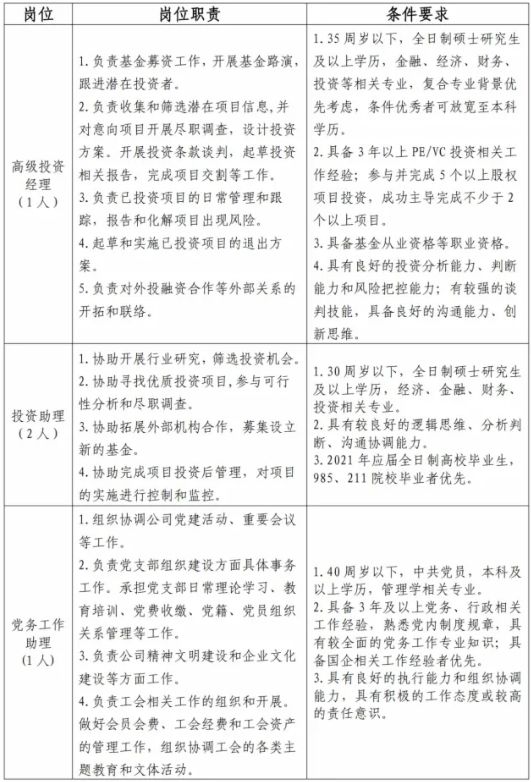 (一)招聘岗位、人数高级投资经理 1人投资助理 2人党务工作助理 1人(二)岗位职责及资格条件