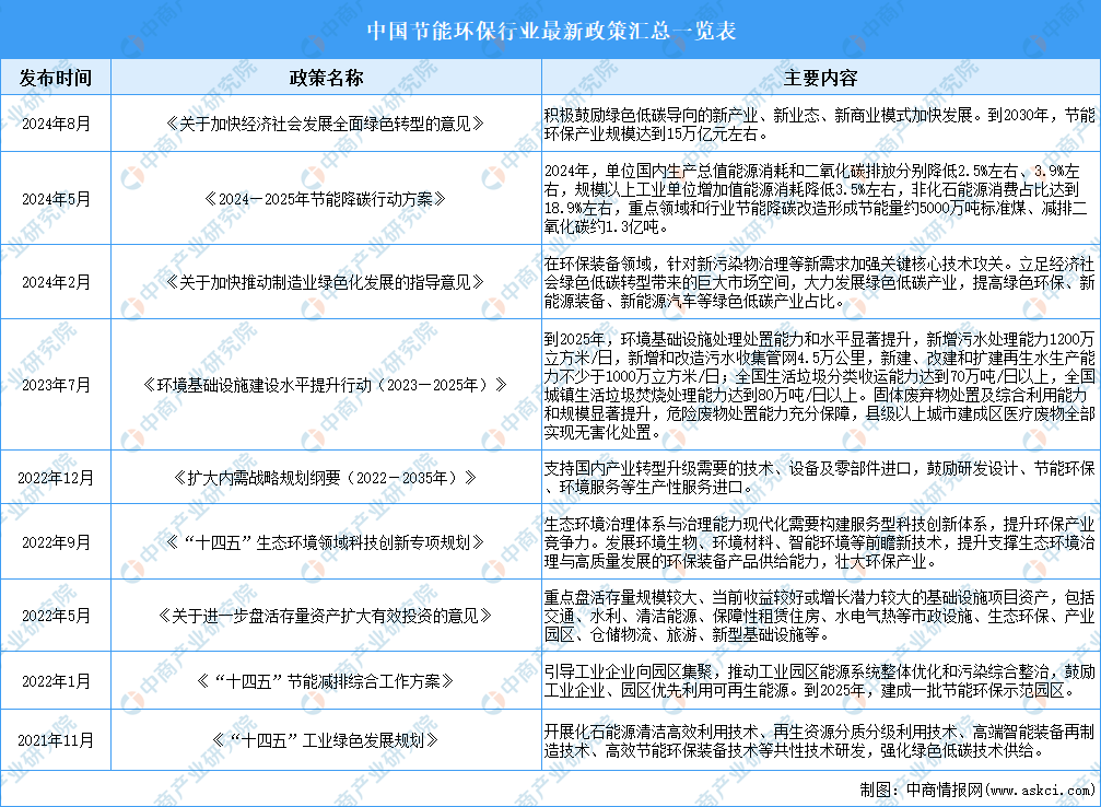 节能环保产业是国家战略新兴产业的重要组成部分。近年来,我国政府及相关部门出台了《关于加快经济社会发展全面绿色转型的意见》《2024—2025年节能降碳行动方案》《关于加快推动制造业绿色化发展的指导意见》《环境基础设施建设水平提升行动(2023—2025年)》等一系列政策促进节能环保产业发展。具体政策如下:
