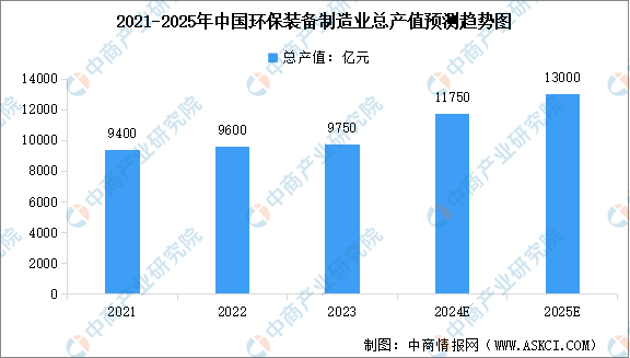 “绿色低碳转型”背景下,中国环保产业进入快车道,环保设备市场规模正逐步扩大。根据中商产业研究院发布的《2024-2029年中国环保设备市场调研及前景预测报告》,2022年中国环保装备制造业产值同比增长2%,达到9600亿元,2023年环保装备制造业总产值超过9700亿元。根据工信部发布的数据,预计到2025年,中国环保装备制造业产值将提高至1.3万亿元。
