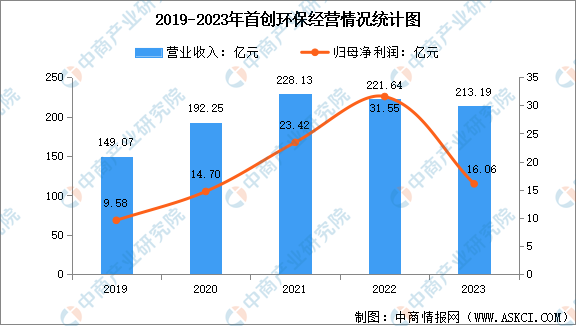 从经营情况来看,2023年,首创环保实现营业收入213.19亿元,同比下降3.82%;归母净利润为16.06亿元,同比下降49.09%。