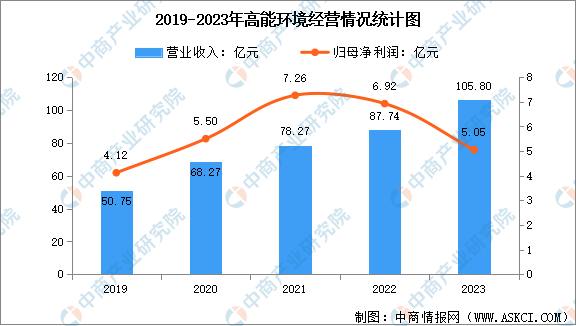 从经营情况来看,2023年,高能环境实现营业收入105.80亿元,同比增长20.58%;归母净利润5.05亿元,同比下降27.13%。