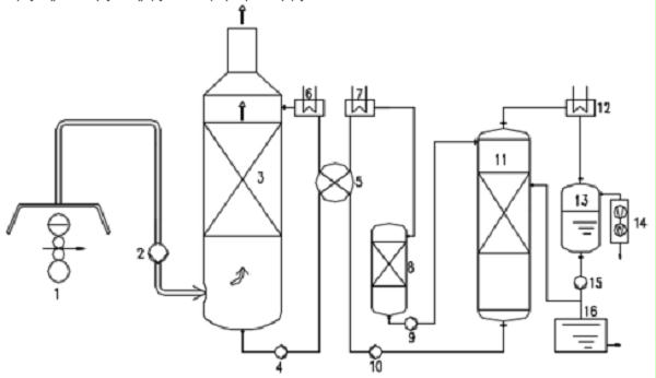 1.冷轧机 2.风机 3.吸收塔 4.9.10.15油泵 5.6.7.12换热器 8.脱气塔11.解吸塔13成品罐 14.真空泵组 16.油箱