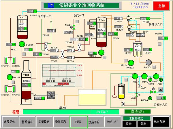 辅助系统用来保证轧制油回收系统中所需要的相应温度、真空度等条件,以确保轧制油成品的纯度与品质,它包含换热器组、加热系统、真空泵组、冷却系统、过滤泵组、成品油系统和相关联的自动控制系统。