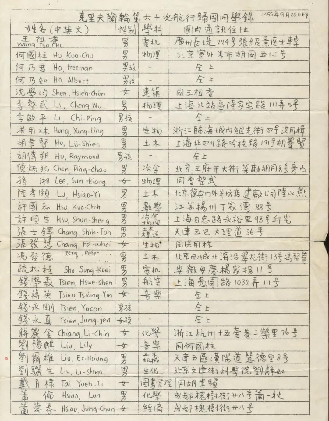 在洛杉矶起锚后,为了便于联系,王祖耆编辑了一张30人的“克利夫兰轮第六十次航行归国同学录”名单。并动手刻板和油印了几十份,分发给大家。