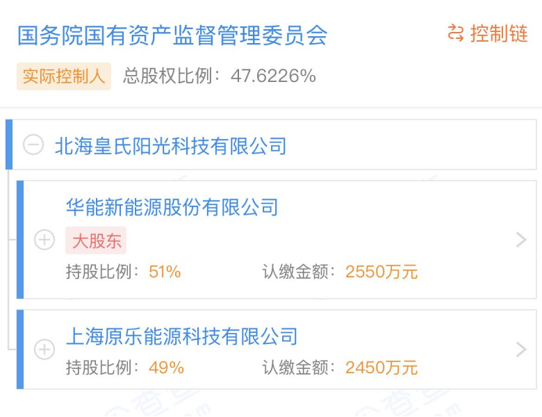 8月28日上午,中国华能集团有限公司广西分公司党委书记、执行董事李宝山在合浦县委副书记、县长白银冰以及皇氏阳光科技有限公司董事长鲁严飞等热情陪同下,共同参加了北海皇氏阳光科技有限公司合浦县一期3GW高效光伏组件制造项目开工仪式。企查查数据显示,华能新能源已经成为北海皇氏央国科技有限公司的控股股东,股权占比51%。