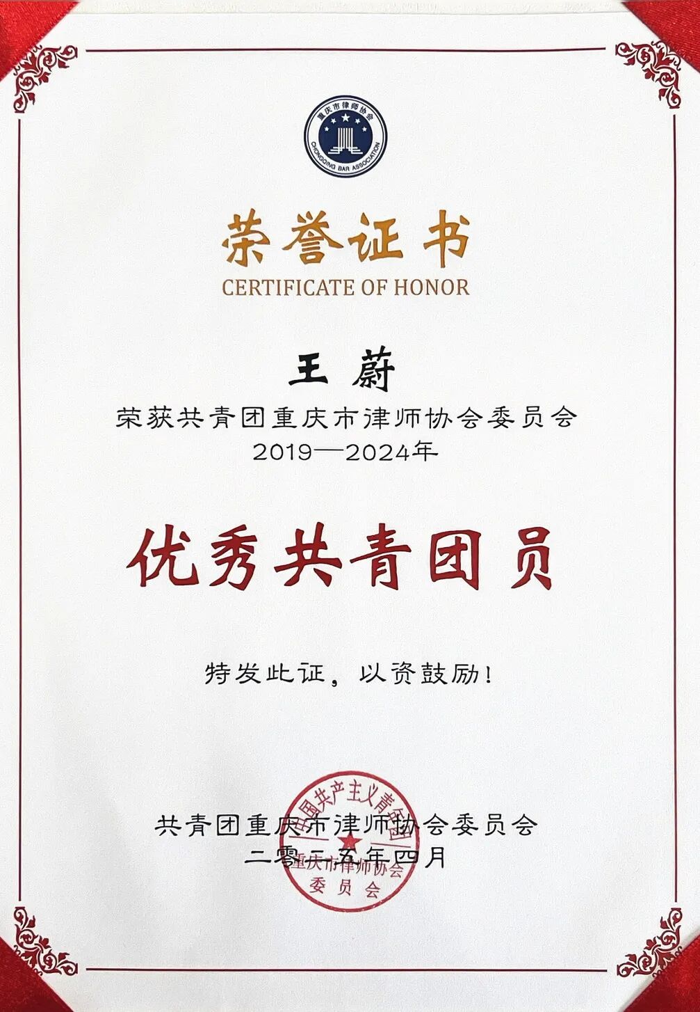 大会对律师行业10个先进共青团组织、49名优秀共青团员、10名优秀共青团干部进行了通报表扬并颁奖。泰和泰(重庆)律师事务所团支部荣获共青团重庆市律师协会委员会颁发的“2019 - 2024 年先进共青团组织”荣誉称号,王蔚律师受到“优秀共青团员”表彰。