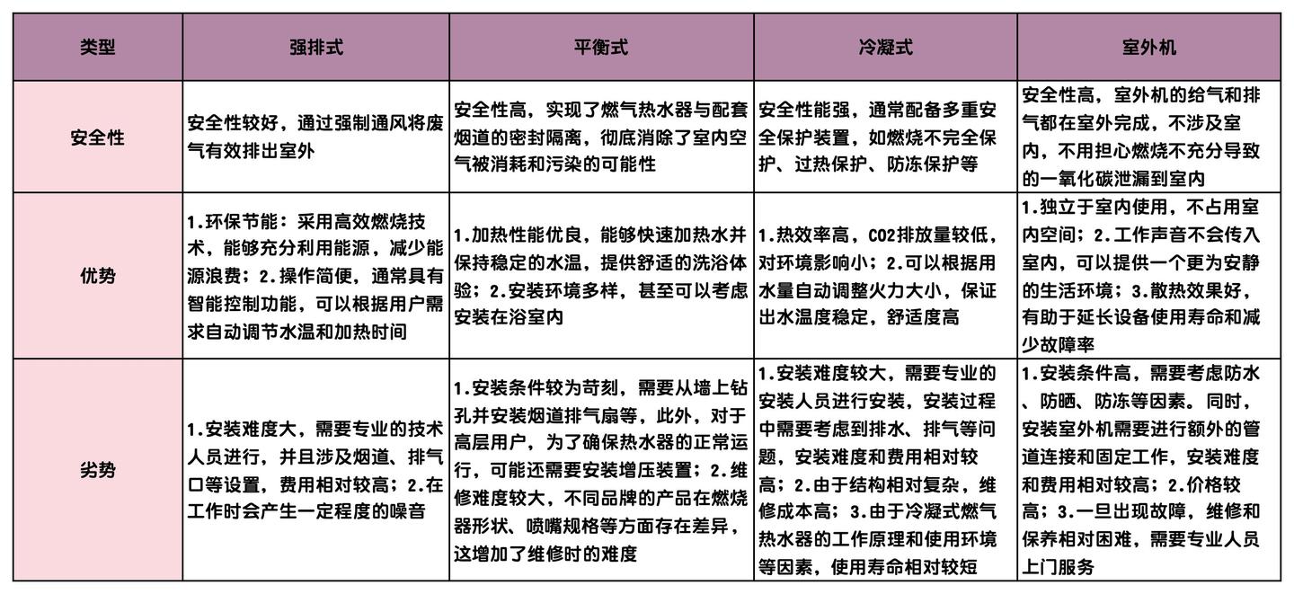 其他四种类型的热水器在安全性上都表现良好,博主已经把它们的优势和劣势整理成表格,方便大家的对比选择。