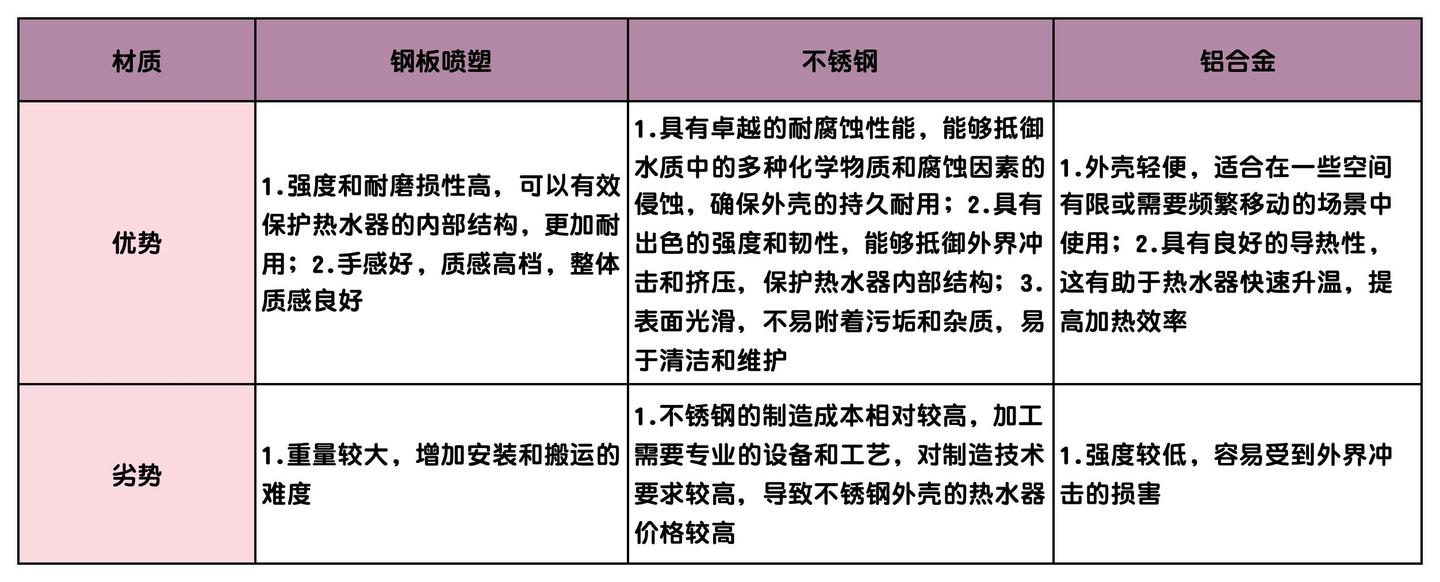 燃气热水器的外壳材质也多种多样,包括钢板喷塑、不锈钢和铝合金等。