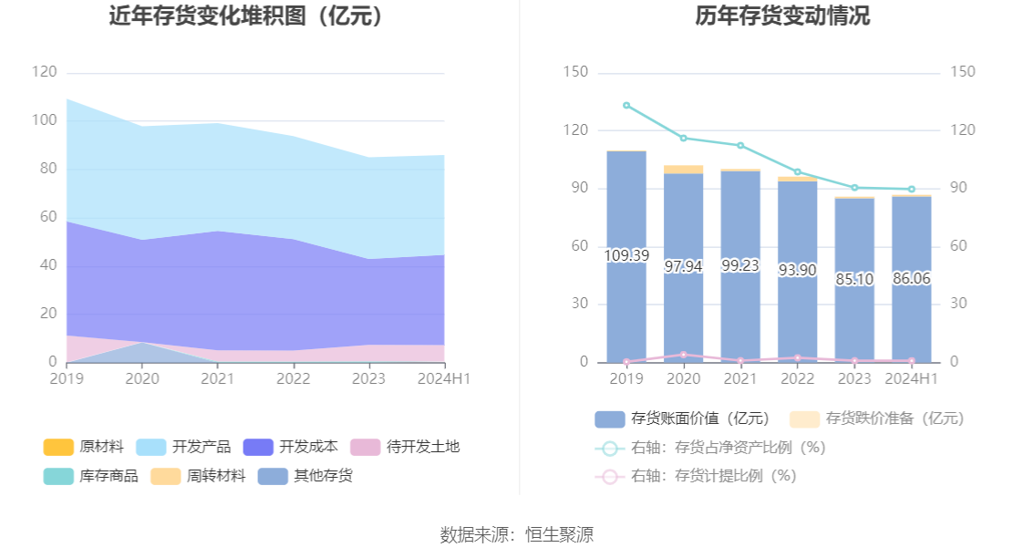 从存货变动来看,截至2024年上半年末,公司存货账面价值为86.06亿元,占净资产的89.83%,较上年末增加9531.01万元。其中,存货跌价准备为8235.13万元,计提比例为0.95%。