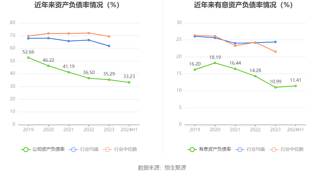 在偿债能力方面,公司2024年上半年末资产负债率为33.23%,相比上年末下降2.06个百分点;有息资产负债率为11.41%,相比上年末上升0.42个百分点。