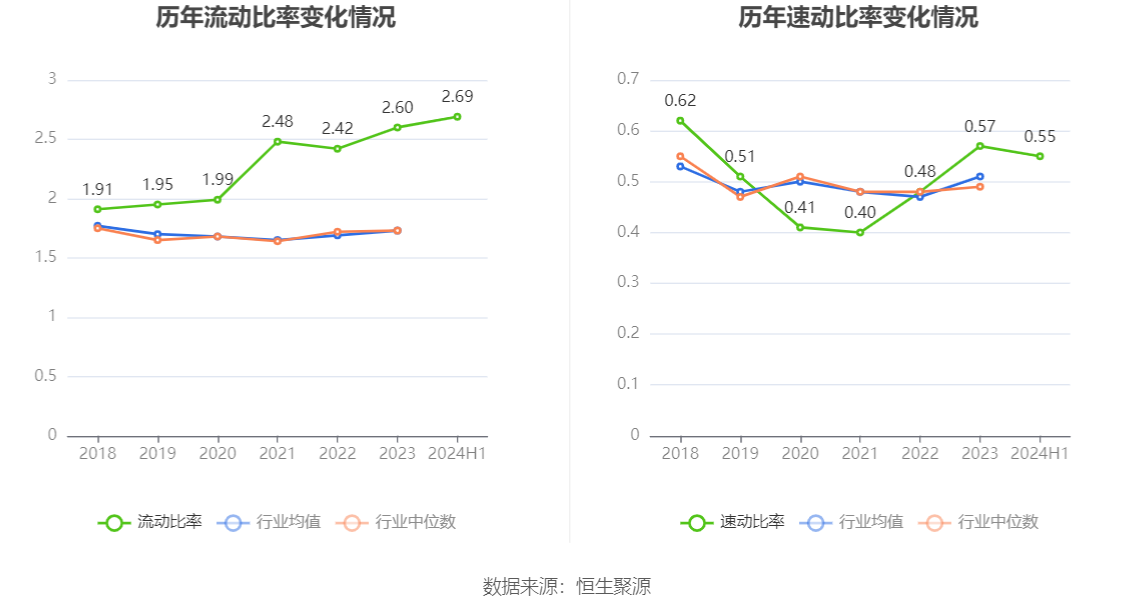 2024年上半年,公司流动比率为2.69,速动比率为0.55。