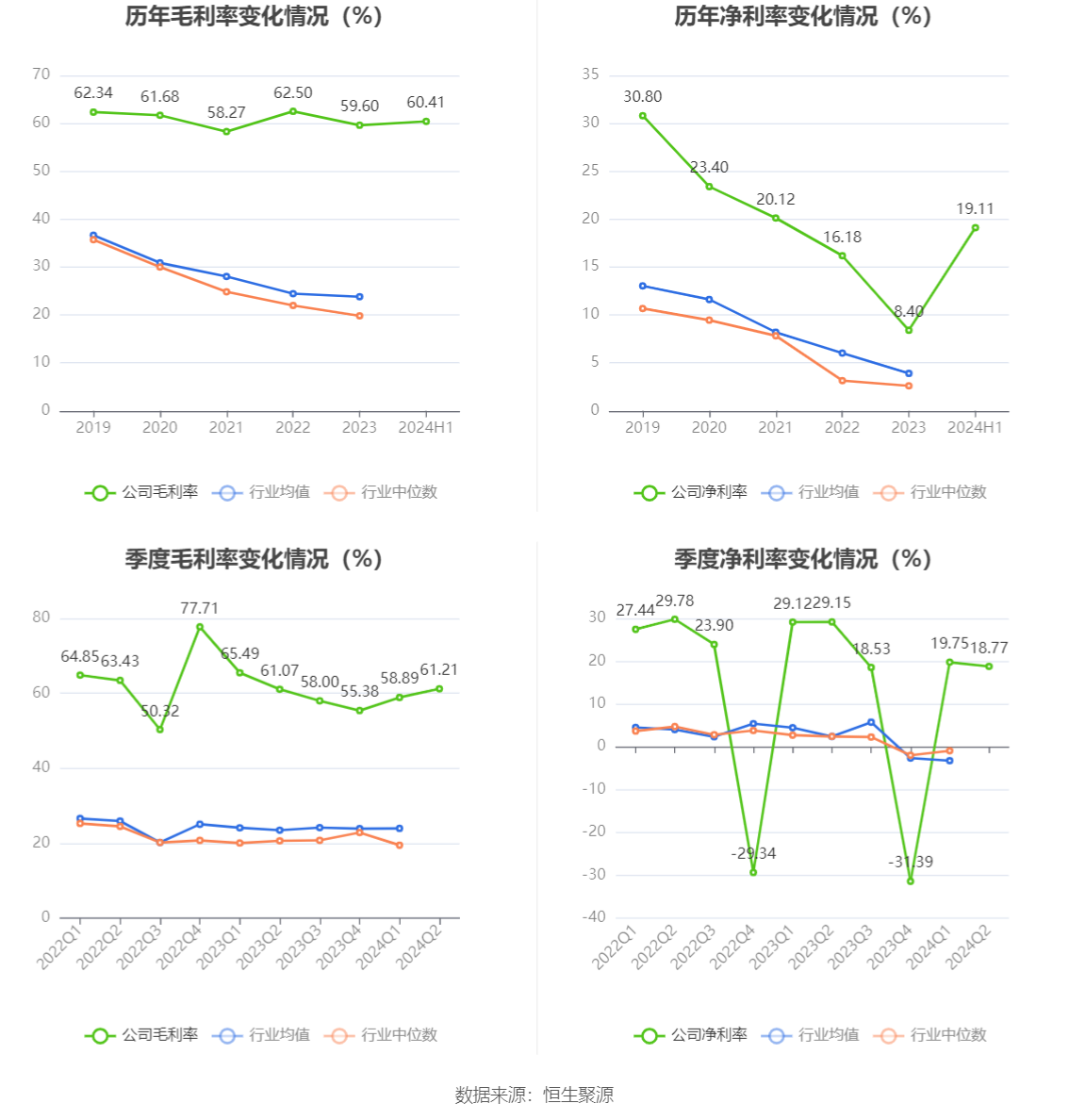 2024年上半年,公司毛利率为60.41%,同比下降2.52个百分点;净利率为19.11%,较上年同期下降10.03个百分点。从单季度指标来看,2024年第二季度公司毛利率为61.21%,同比上升0.14个百分点,环比上升2.32个百分点;净利率为18.77%,较上年同期下降10.38个百分点,较上一季度下降0.98个百分点。