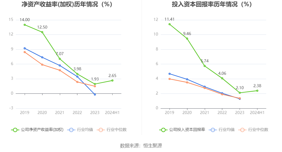 数据显示,2024年上半年公司加权平均净资产收益率为2.65%,较上年同期下降0.48个百分点;公司2024年上半年投入资本回报率为2.38%,较上年同期下降0.21个百分点。