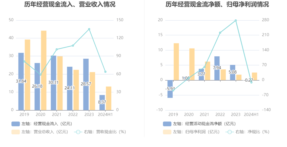 2024年上半年,公司经营活动现金流净额为-2749.12万元,同比减少4.35亿元;筹资活动现金流净额-4867.15万元,同比减少246.82万元;投资活动现金流净额1.18亿元,上年同期为-3.25亿元。