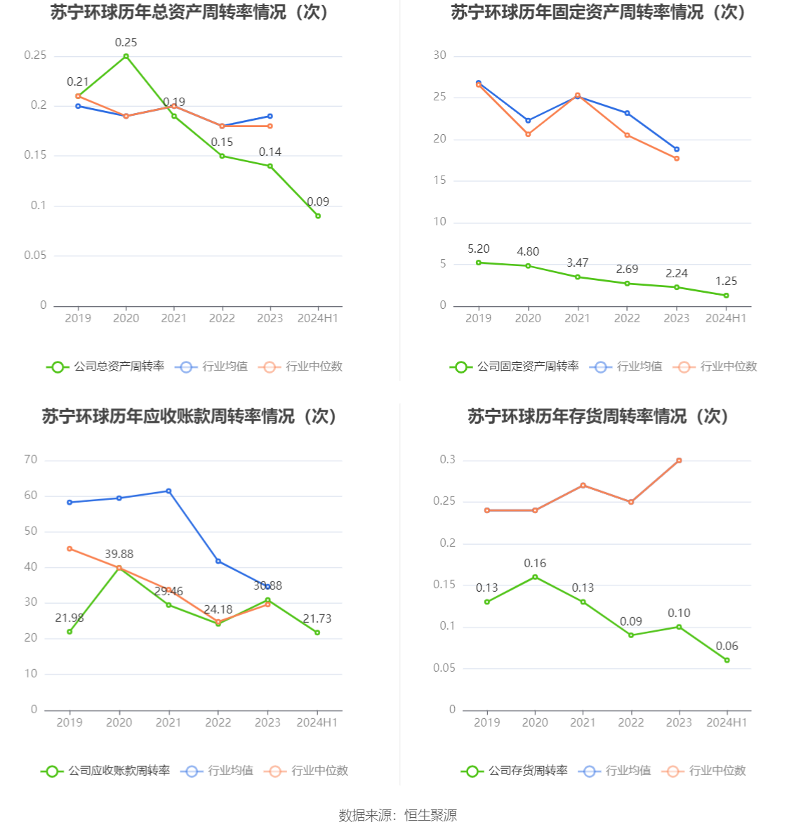 营运能力方面,2024年上半年,公司总资产周转率为0.09次,上年同期为0.07次(2023年上半年行业平均值为0.07次,公司位居同行业47/79);固定资产周转率为1.25次,上年同期为1.03次(2023年上半年行业平均值为8.45次,公司位居同行业66/79);公司应收账款周转率、存货周转率分别为21.73次、0.06次。
