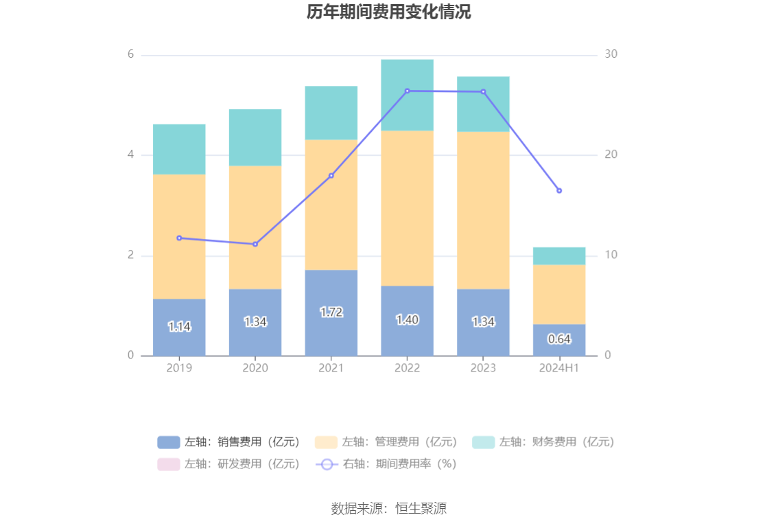 2024年上半年,公司期间费用为2.16亿元,较上年同期增加878.89万元;但期间费用率为16.49%,较上年同期下降3.56个百分点。其中,销售费用同比下降10.32%,管理费用同比下降2.93%,财务费用同比增长130.96%。