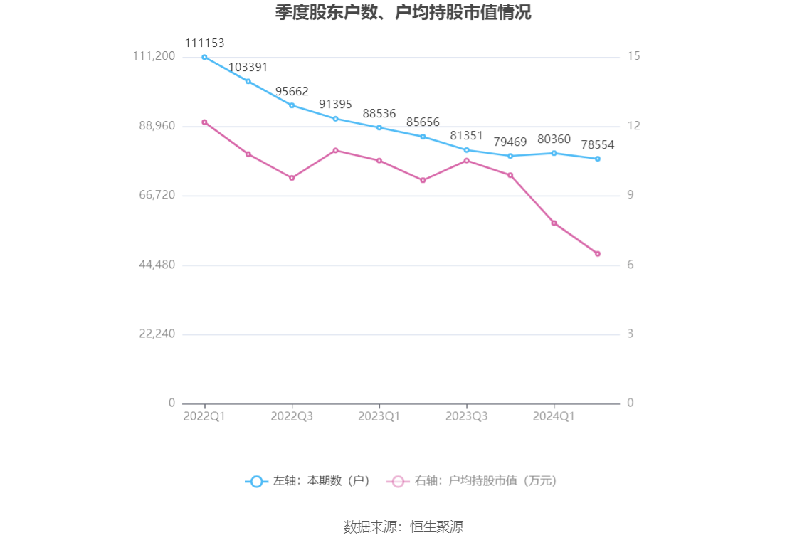 筹码集中度方面,截至2024年上半年末,公司股东总户数为7.86万户,较一季度末下降了1806户,降幅2.25%;户均持股市值由一季度末的7.82万元下降至6.49万元,降幅为17.01%。
