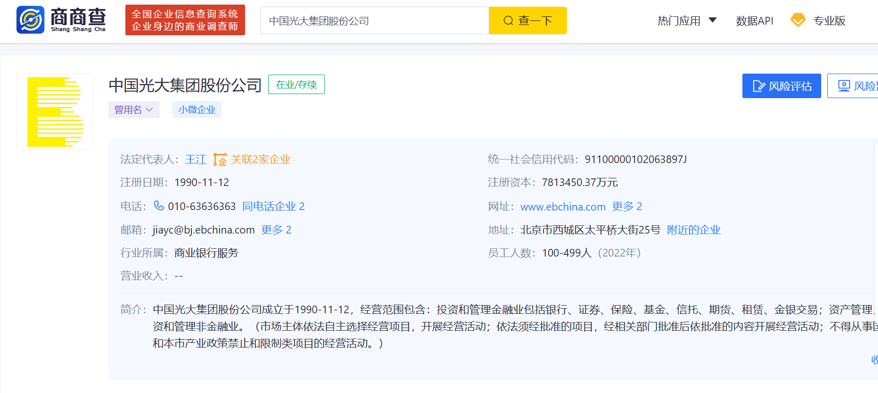 “商商查”显示,中国光大集团成立于1990年11月,总部位于北京市西城区太平桥大街25号,注册资本7813450.37万元。目前的法定代表人为现任中国光大集团股份公司党委书记、董事长王江。