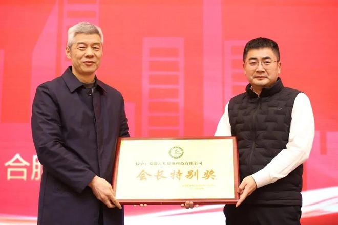 高俊文会长主持举行了轮值会长交接仪式,上一任轮值会长安徽古井健康科技有限公司罗天祥董事长向新任轮值会长美而特智能后勤服务有限公司常征董事长移交轮值会长旗。