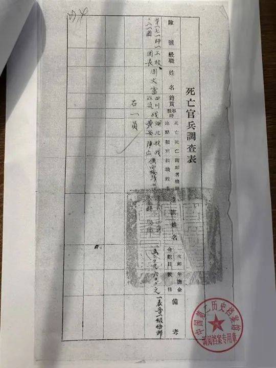 死亡官兵调查表,记载着周文富为171师1021团团长,籍贯为四川双流,于湖北黄安抗战阵亡(中国第二历史档案馆 供图)