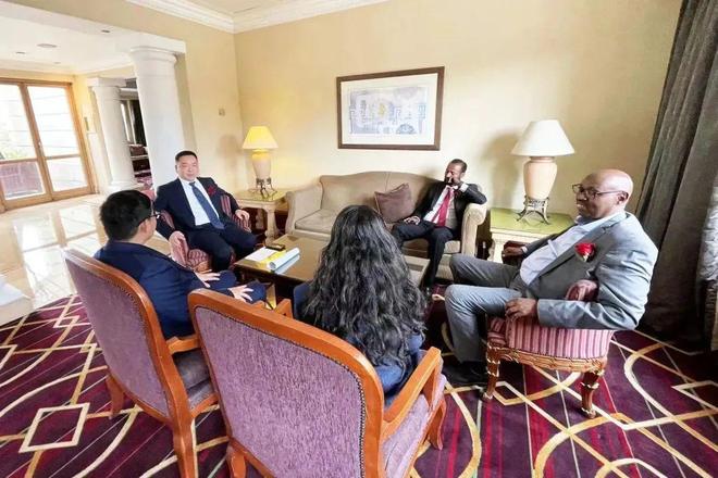在埃塞期间,王思联总裁一行拜访了中国驻埃塞俄比亚大使赵志远,与中国外交部服务中心、北京千代福信息技术有限公司举行工作座谈,与赵志远一行现场调研签证中心筹开工作。