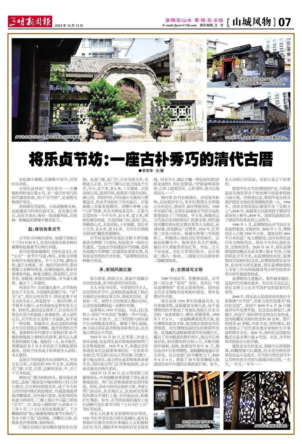 贞节坊是闽西北地区为数不多的融旌表式牌楼门与家祠、祖屋连为一体的古代建筑。“这座贞节坊建造年代明确,是研究福建古代牌楼门式建筑的重要实例,具有弥足珍贵的历史价值。”县博物馆馆长林薇介绍说。