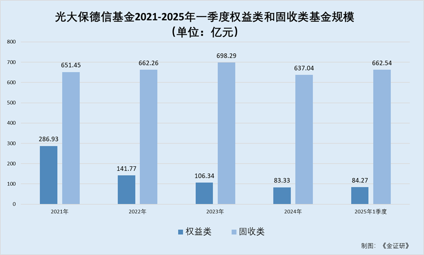 数据显示,2021-2024年末2025年1季度末,光大保德信旗下股票型基金的净资产合计分别为41.15亿元、30.4亿元、31.95亿元、24.09亿元、24.96亿元;混合型基金的净资产合计分别为245.78亿元、111.37亿元、74.39亿元、59.24亿元、59.31亿元。