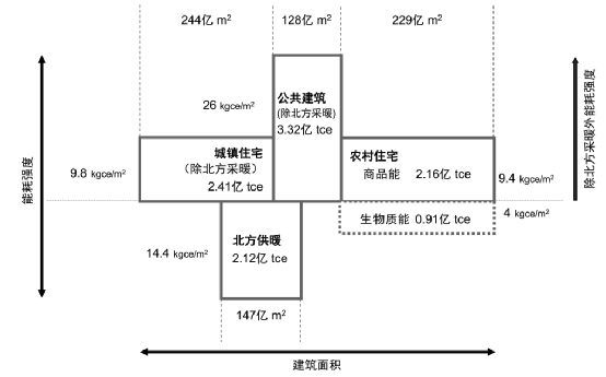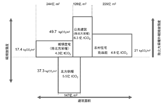 将四部分建筑碳排放的规模、强度和总量表示在图11中的方块图中,横向表示建筑面积,纵向表示四单位平米碳排放强度,四个方块的面积即是碳排放总量。可以发现四个分项的碳排放呈现与能耗不尽相同的特点:公共建筑由于建筑能耗强度最高,所以单位建筑面积的碳排放强度也最高;而北方供暖分项由于大量燃煤,碳排放强度次之;农村住宅和城镇住宅单位平米的一次能耗强度相关不大,但农村住宅由于电气化水平低,燃煤比例高,所以单位平米的碳排放强度高于城镇住宅。