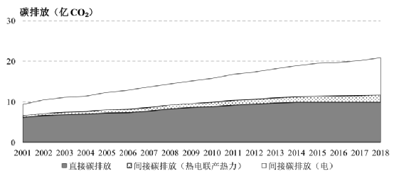 建筑能耗总量的增长、能源结构的调整都会影响建筑运行相关的二氧化碳排放。建筑运行阶段消耗的能源种类主要以电、煤、天然气为主,其中:城镇住宅和公共建筑这两类建筑中70%的能源均为电,以间接二氧化碳排放为主,北方城镇中消耗的热电联产热力也会带来一定的间接二氧化碳排放;而北方供暖和农村住宅这两类建筑中,能源消耗中使用煤的比例高于电,在北方供暖分项中用煤的比例超过了80%,农村住宅中用煤的比例约为60%,这会导致大量的直接二氧化碳排放。随着我国电力结构中零碳电力比例的提升,我国电力的平均排放因子从2001年的771gCO2/kWh下降到2018年的553gCO2/kWh[16];而电力在建筑运行能源消耗中比例也不断提升,这两方面都显著地促进了建筑运行用能的低碳化发展。