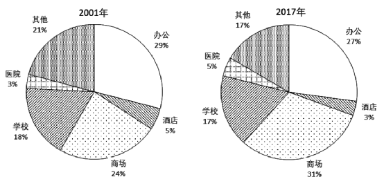 图4各类公共建筑竣工面积占比(左2001年,右2017年)