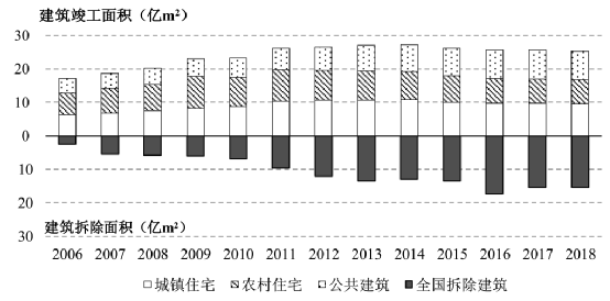图3中国各类民用建筑竣工面积及城镇建筑拆除面积(2006~2018年)