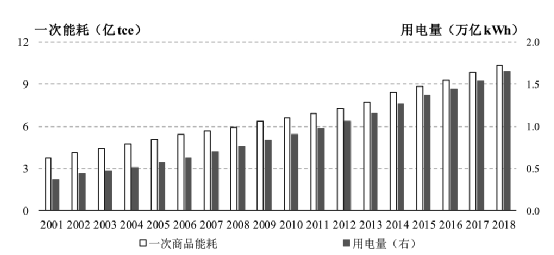 图8中国建筑运行消耗的一次能耗和电总电量(2001年~2018年)