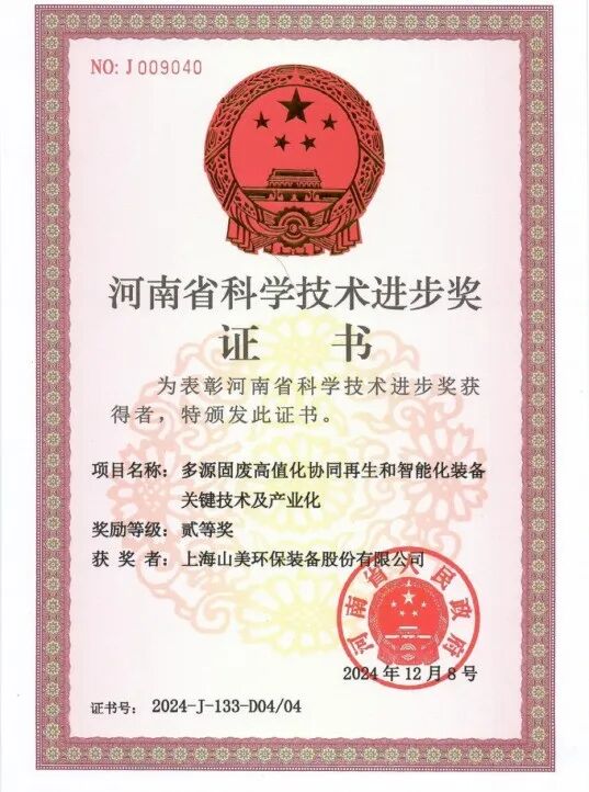 近期,上海山美环保装备股份有限公司与郑州一帆机械设备有限公司、洛阳理工学院、昆明理工大学共同研发的“多源固废高值化协同再生和智能化装备关键技术及产业化”项目荣获河南省科学进步奖二等奖。该项目创建了多源固废“三位一体”联合处理系统,研究多源固废智能化分离与精细分选工艺、研究了高度集成模块化结构、研究多级产品设计、调控及强化技术,发明了多料仓连续供料方法,创新了连续生产工艺及设备。产品在国内外十余个固废处理生产线项目上成功应用,对固废物综合利用技术上具有重要的现实意义。