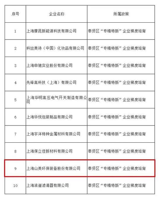喜讯如春风送暖,为新年伊始注入蓬勃朝气。近日,2024年度奉贤区“专精特新”企业梯度培育称号(区级“单项冠军”培育企业)公示名单正式发布,上海山美环保装备股份有限公司(以下简称“上海山美股份”)凭借卓越的专业能力和技术实力,荣获奉贤区“专精特新”企业梯度培育称号荣誉这一荣誉不仅是对上海山美股份在环保装备领域深耕细作的肯定,更是对我们推动中小企业高质量发展贡献的认可。