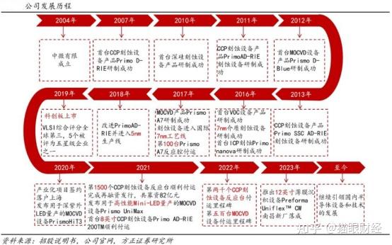 公司主要从事高端半导体设备及泛半导体设备的研发、生产和销售。由MOCVD和刻蚀设备起步,逐渐拓展至LPCVD、ALD等薄膜沉积及其他设备,广泛布局半导体集成电路制造、先进封装、LED外延片生产、功率器件、MEMS制造以及其他微观工艺的高端设备。