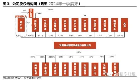 公司股权结构清晰,实际控制人控制力稳。截止2024年一季度末,沈阳先进为公司第一大股东,持有公司16.91%的股份;公司实际控制人为董事长兼总经理郑广文,直接和间接合计可控制公司24.56%的股份表决权,比第二大股东宁波祥浦(持股16.17%)高出8.39%,因此董事长郑广文对公司生产经营、重大决策具有稳定的实际控制力。其他持有本公司4%以上股份的股东包括上海国投、辽宁中德、辽宁科发。