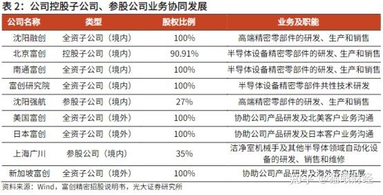 同时,公司有多家控股,参股子公司。旗下拥有沈阳融创、南通富创、富创研究院3家境内全资子公司和美国富创、日本富创、新加坡富创3家境外全资子公司和北京富创、上海广川、沈阳强航等多家境内控股或参股公司。其中,公司参股35%的上海广川为国内研制设备机械手的领军企业之一,拥有多项半导体制造的相关发明专利。