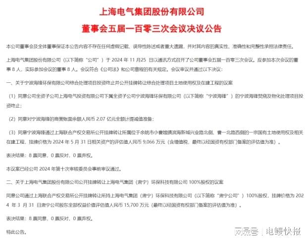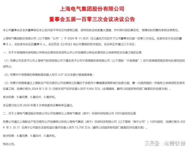 该公司在第二则公告中披露,该公司董事会五届一百零三次会议审议通过《关于宁波海锋环保有限公司综合处理项目投资终止并公开挂牌转让综合处理项目土地使用权及在建工程的议案》,(1)同意公司全资子公司上海电气投资有限公司(以下简称“电气投资”)下属全资子公司宁波海锋环保有限公司(以下简称“宁波海锋”)实施的宁波海锋焚烧及物化处理项目(以下简称“综合处理项目”)投资终止;(2)同意对宁波海锋的商誉账面余额人民币2.07亿元全额计提减值准备;(3)同意宁波海锋通过上海联合产权交易所(以下简称“联交所”)公开挂牌转让所属位于余姚市小曹娥镇滨海新城兴业路北侧、曹一北路西侧的一宗国有土地使用权及相关在建工程,挂牌价格为2024年5月31日相关资产的评估值人民币9,066万元(含增值税,最终以经国资有权部门备案的评估值为准)(以下简称“本次交易”)。